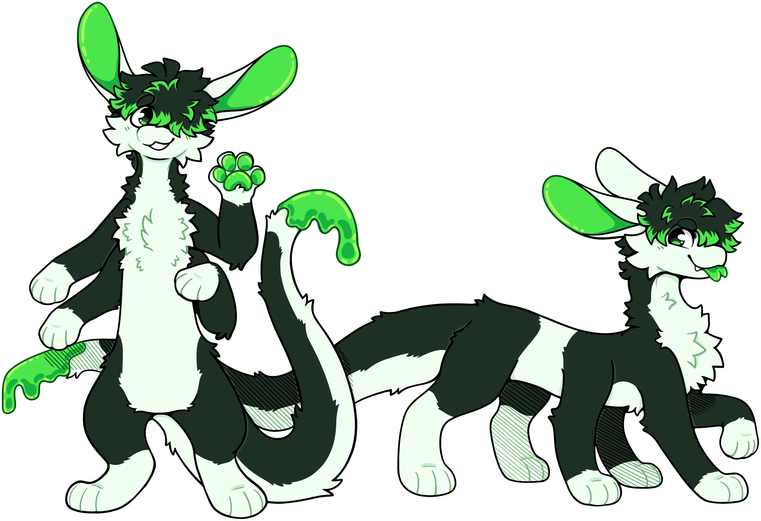 In her basal (default) form, Ash appears as a very long, mammal-like animal with black and white fur and softly luminescent neon green skin. Her tail is nearly twice as long as her torso and ends in a 'goopy' green tip.