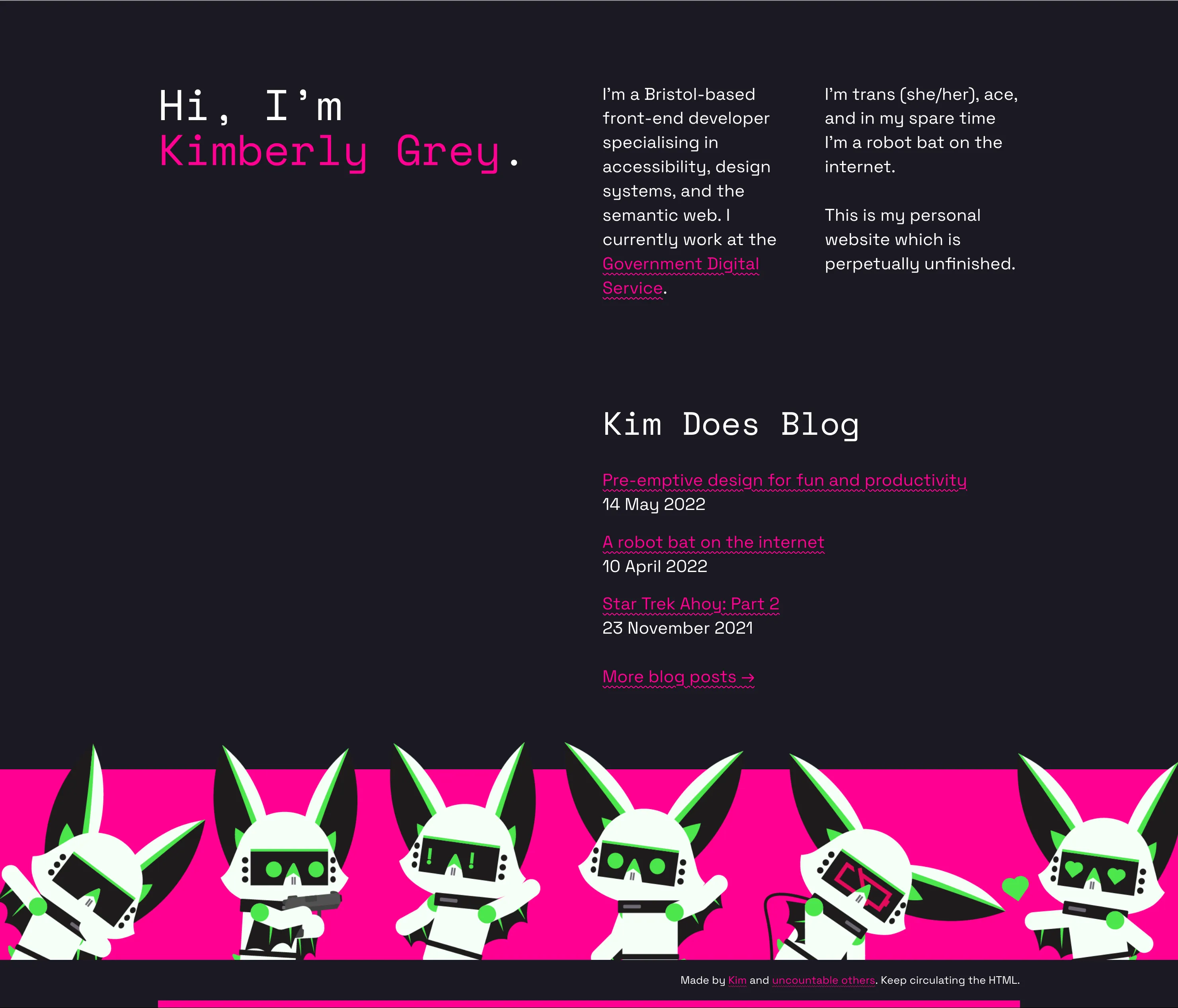 The design has changed quite a lot since then, but many elements that persist to this day are there: the use of Space Mono and Space Grotesk, an abundance of robot bats, a dedicated dark theme, and hints of the same purple and green palette that the site still uses for its light mode.
