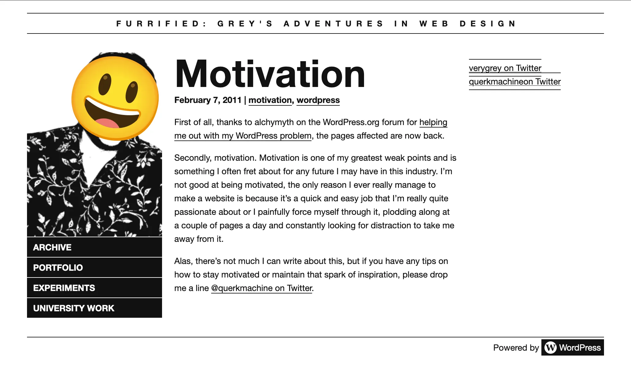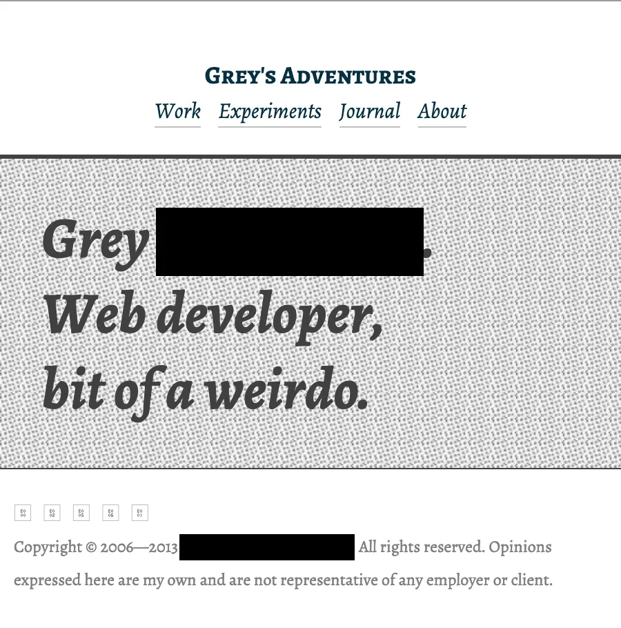 It wouldn’t be until 2010 that I started working on a new personal website. This was also around the time I stopped using my birth name in favour of a moniker. My university years were initially branded under the name “Furrified” (a domain originally picked up for, unsurprisingly, an unrealised furry fandom project), with the subtitle “Grey’s Adventures in Web Design”.