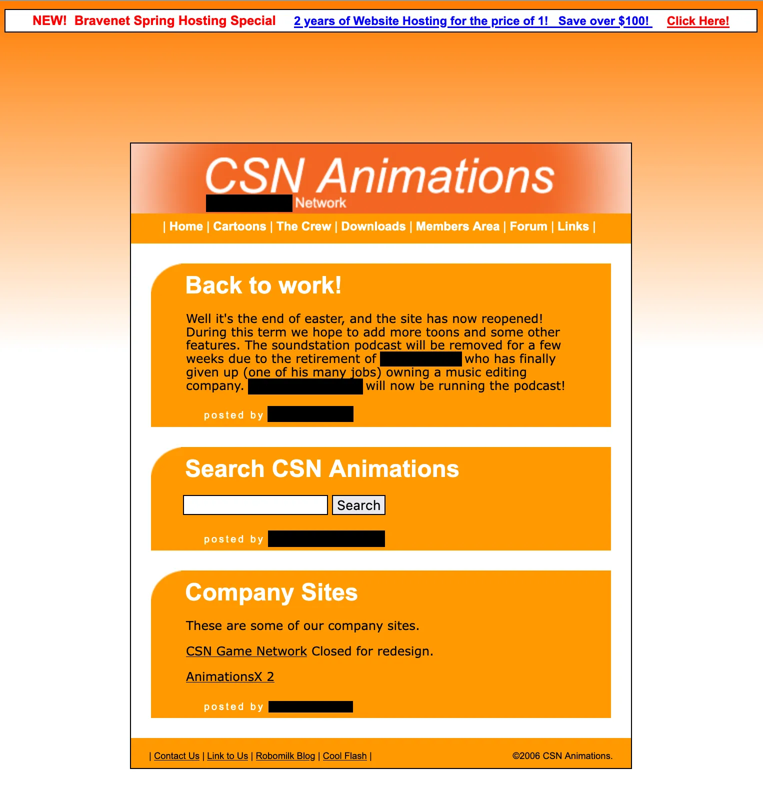 Around this time I started making websites for my school friends. Probably the premiere amongst these would be “CSN Animations”—the sequel to a site called animationsx and prequel to one named Motus Animation—all of which hosted various Flash animations created by about half a dozen of my peers. It was impeccable. It had actual CSS! And rounded corners before border-radius existed!