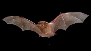 Photograph of a bat in flight. It’s facing towards the camera with its beady eyes and mouth agape, as though it’s been shocked by the viewer.