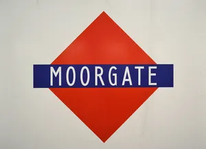 The non-standard Underground roundel at Moorgate. A red diamond and with a dark blue rectangle crossing horizontally through its middle. The word ‘Moorgate’ is written in white, narrow lettering inside of the rectangle.