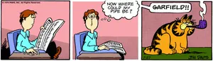Panel 3: Cut to Garfield, an overweight orange and black cat, who is sitting on the floor contentedly smoking a wooden pipe. A speech bubble from outside of the panel exclaims, ‘Garfield!’